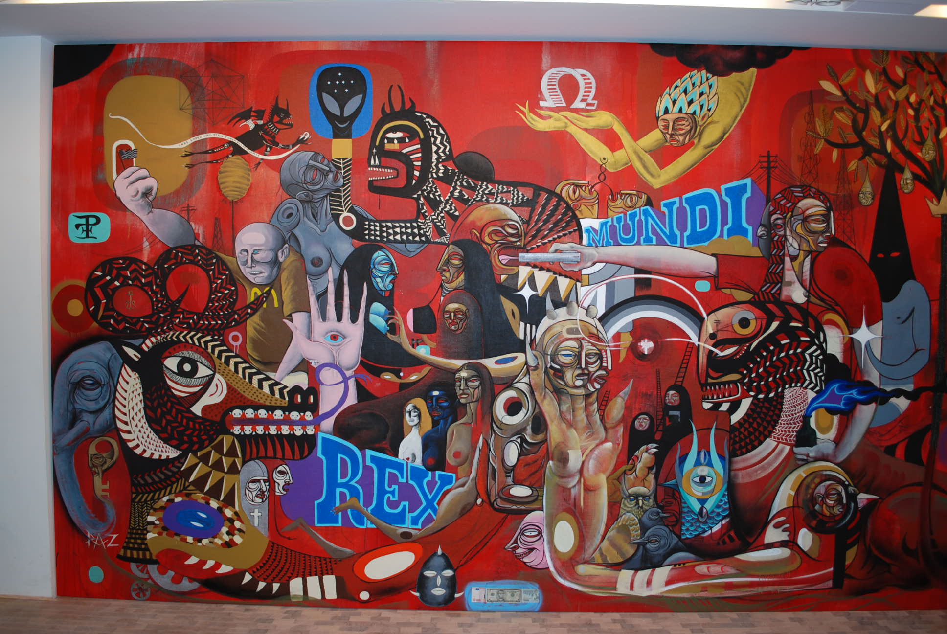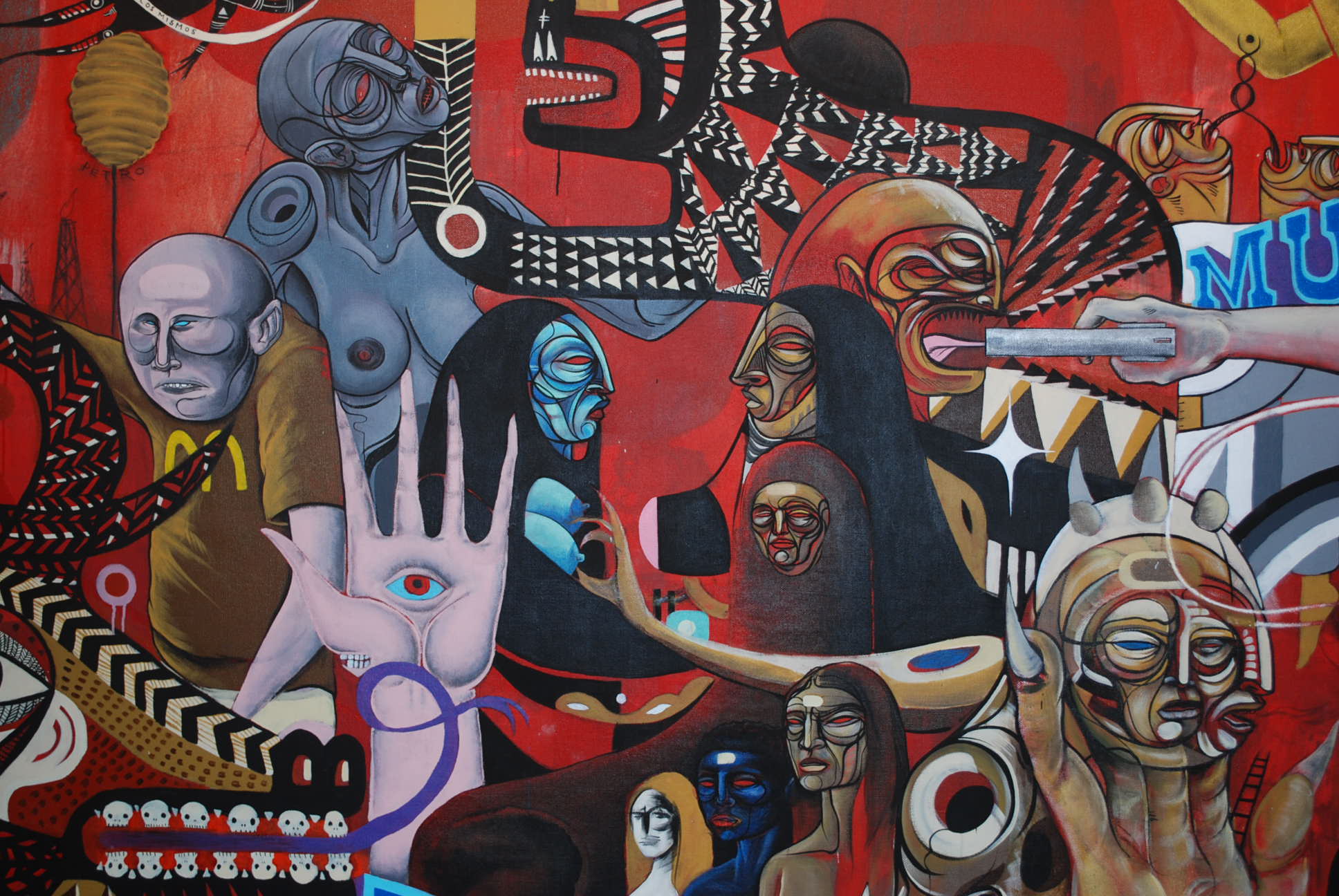 Doze was in Amsterdam in June, collaborating with Fefe Talavera for an exhibition at K-Space Gallery. Fefe is a 26 year old Sao Paulo artist, who also has credits to her name of opening for Missy Elliott on tour. Her artworks often feature monsters and fabulous, vaguely terrifying creatures, like THESE. For the K-Space show, each artist produced some solo works, and collaborated on a huge piece, which blended Fefe’s monsters with Doze’s characters using a palette of rich, lush colour: