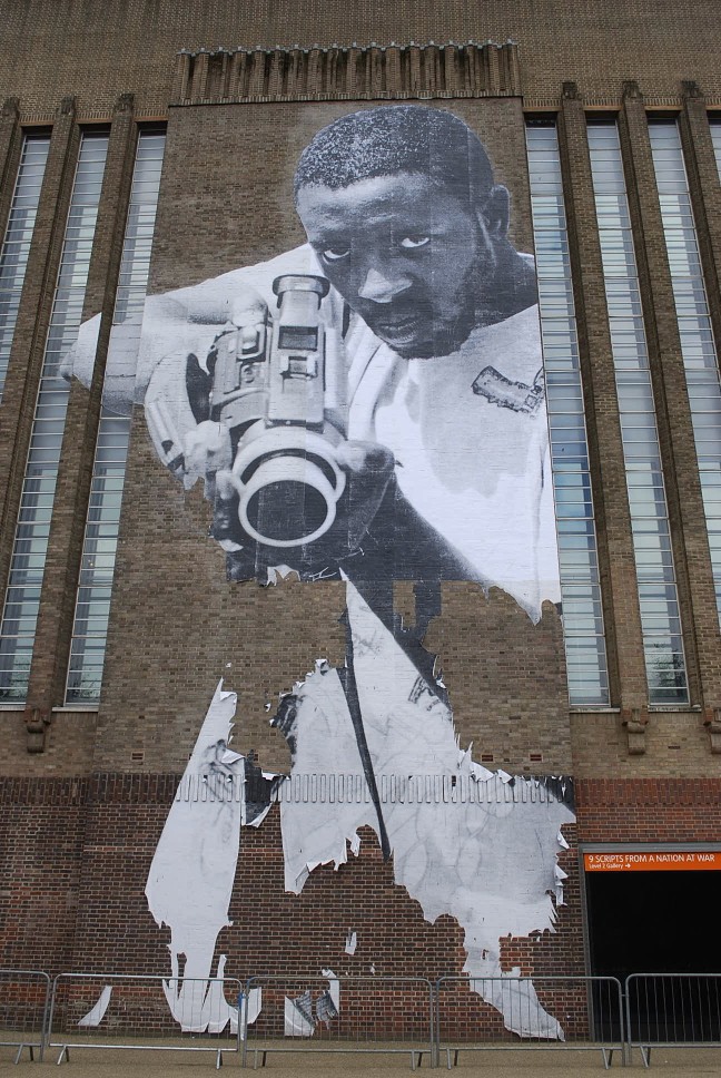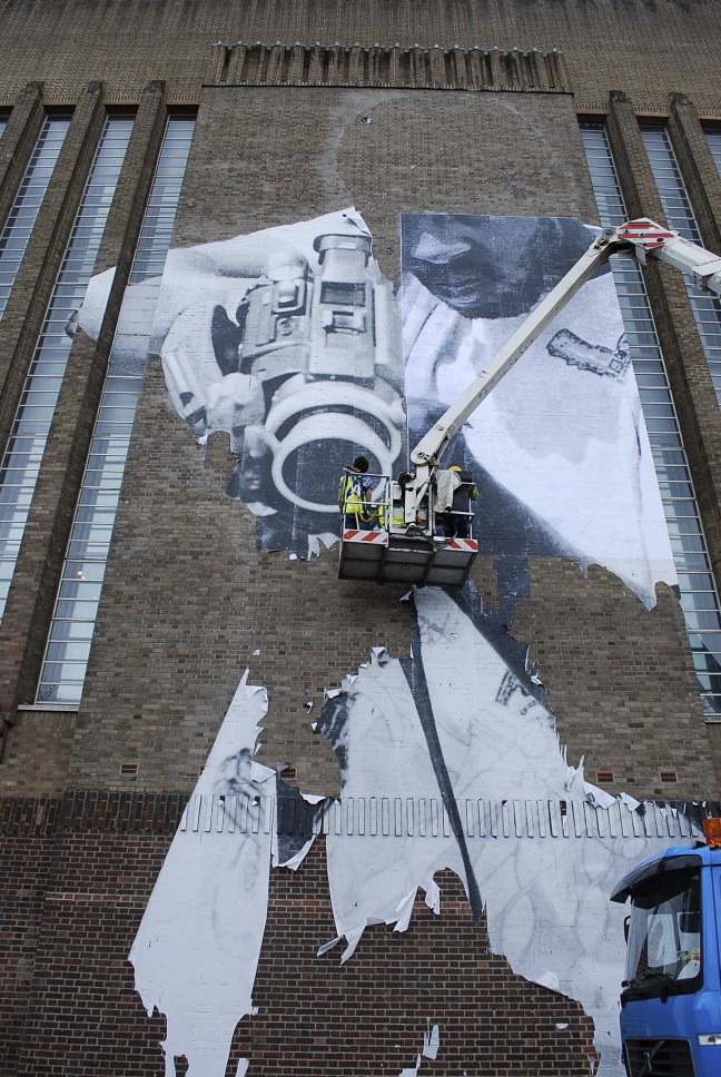 JR’s pasted up image of a young man wielding a video camera was already in peeling tatters (thanks to the rain and wind that you can get in a British summer). On the first day I visited, repair work was being done on the JR image. This actually helps to show the dominating scale of the works, since you can see how small the cherry picker looks next to the photograph:
