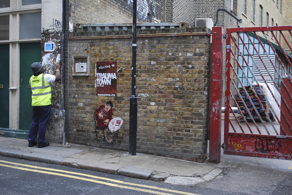 Blank walls were what I found in many streets of London recently. In streets where, in July, there had been a lively ‘conversation’ (to use Russell Howze’s term – thanks, Russell) of stickers, tags, stencils, objects, paste-ups, by October many of them had been cleaned up, all over Shoreditch, and up and down Brick Lane. Turns out that the local councils (London Borough of Hackney and London Borough of Tower Hamlets) had decided it was time for a cleaning blitz, with the result that hundreds of images had been buffed.