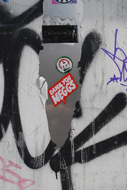 In the midst of other stickers and tags on this doorway, there’s a sticker which says ‘Damn You Meggs’ – Meggs is a member of the Everfresh collective in Melbourne (and I’ve written here previously about his work in connection with that of D*face and Anthony Lister).