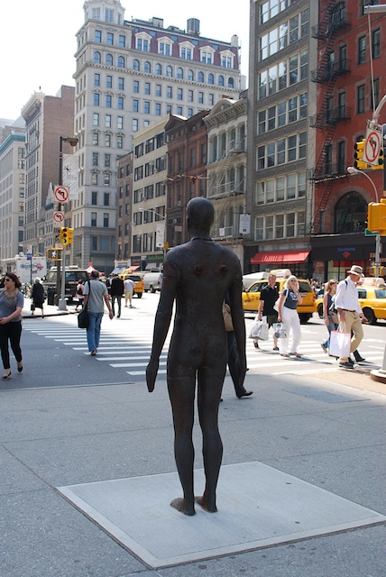 The first of these is Event Horizon, a massive work by the British artist, Antony Gormley. Gormley, probably best known for his sculpture The Angel of the North in Gateshead, makes bronze casts, often of his body, and then places the resulting figures in public spaces – sometimes on a beach (as in Liverpool), sometimes in the centre of cities (as in Birmingham), and, with this work, on the tops of buildings. Instead of forging a single figure, in Event Horizon there are thirty one. Two were placed on the ground, in Madison Square Park, so that people can stand next to them, touch them, photograph them from a place of proximity:
