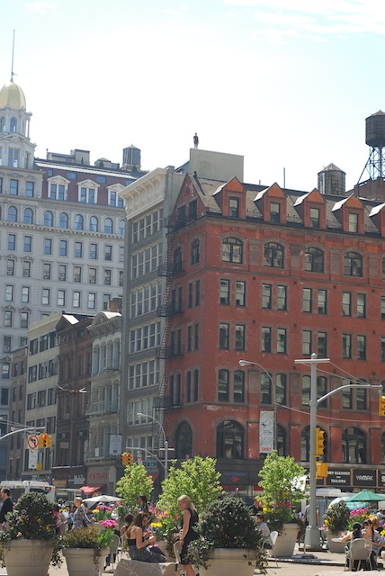 Then, when they raise their gaze upwards to the tops of the nearby buildings, they project the heavy bronze figure from the ground upwards, onto the high perches around the park.