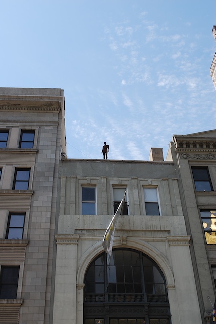 The ‘figure on the roof’ is obviously one that is often depicted in film and television as someone who is about to jump – a potential suicide. And apparently the New York Police Department were briefed about the installation so that, if anyone called 911 to report someone on the rooftop, the police would be aware of the statues and their locations and would not needlessly respond to the call.