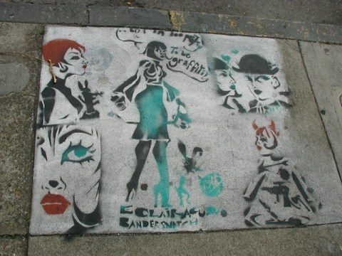 Or the stencil artists who place images and text on the sidewalk, such as these (both from San Francisco):