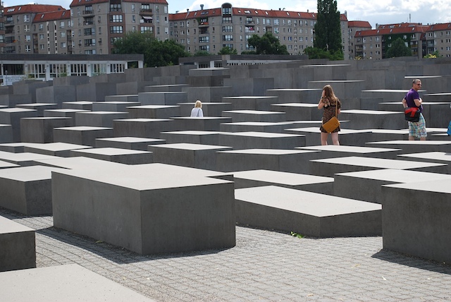 I’m in Berlin for a few weeks, doing some research on street art here (about which more later, no doubt). But Berlin is not only a city filled with uncommissioned art, it is also a city immersed in the work of memorialisation of the past through public art and sculpture. This is very much one of my interests – how a city represents its relation to events which have marked its identity and character – and so on Wednesday, I went to see the Memorial to the Murdered Jews of Europe.
