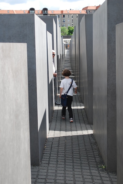 Did her delighted leaping from one corridor to another have an impact upon my affective relation to the site? I certainly found it far less affective than some other Holocaust memorials that I have seen (for example, in Prague and Budapest, and also here in Berlin, on Grosse Hamburger Strasse). So what is the affective relation sought by this particular site? Perhaps it’s not that it failed to generate the solemnity and pensiveness that arises so easily at some other memorial locations, but perhaps instead its affectivity is mutable, intricate and elusive. At any rate, I’ve thought of it and about it many times since we visited a week ago, and in this respect – as a spur to thought – it performs an admirable function.