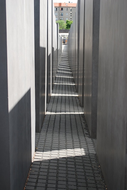 So what was it that was striking, in the experience of being there (as opposed to simply seeing pictures and reading about the memorial’s design)? I noticed immediately (and can vividly remember) the smoothness of the stone used for the grey stelae: to run your hands down the side of one constitutes a beautifully tactile experience.