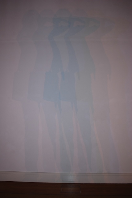 In others, bodies are projected against white screens in shades of pink and blue, or violet and green. Here’s me, taking a photograph of myself in the artwork…