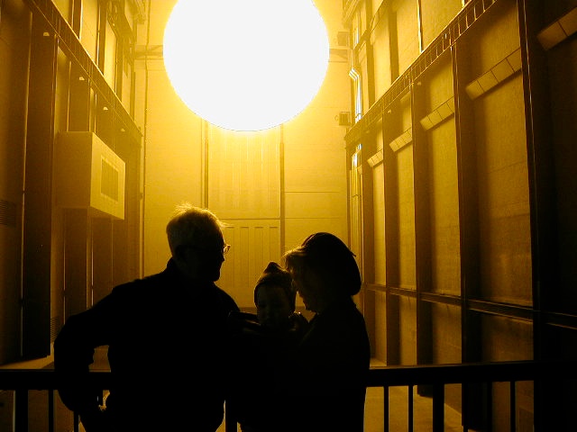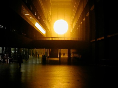 I say this partly because I can still vividly recall my first encounter with Eliasson’s work – back in 2003, in London. Eliasson was one of the artists who was invited to produce a work for the Turbine Hall of the Tate Modern in London, the massive entry hall of the former power station. Eliasson’s work – The Weather Project – created a giant sun at one end of the hall, with the effect that the entire space was bathed in an orange glow: the chimerical orb, no matter what time of day it was viewed, seemed to be in the middle of setting or rising, pouring warmth into the cold grey of a London winter: