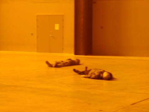 This space inside this room was as hot as a sauna, and initially appeared to be filled with steam. (Although i know I should be fearless in my experience of art, I’m ashamed to report that my first thought was ‘oh no, my hair will go frizzy…’.) But the steam was actually smoke (and so, my hair survived, un-frizzed). The room was filled with smoke, which was coloured by long narrow lights in the ceiling, segmented by barriers, which shone down into the space. The lights in the ceiling were ordered according to the spectrum, so that the smoke in the room was in effect dyed according to the colour of the lights above. The dense smoke in the room meant that you could see only as far ahead as an arm’s length, meaning that all depth of field was lost, and you moved through the spectrum of colour, from one to the next, with no horizon, and no sense of boundary, horizon or limit.
