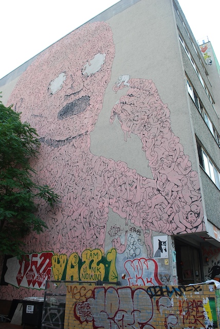 The River Spree constitutes a boundary between Friedrichshain and Kreuzberg, and as you travel over the Oberbaumbrucke (a wonderfully gothic looking bridge), the landscape is dominated by a massive piece by Blu, one of a number he has done in the city. Here’s a close up of the work: