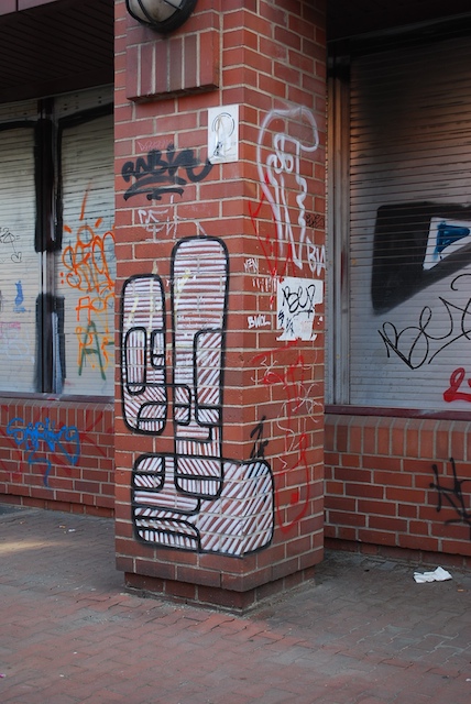 In the first few days that I was there, I went to see the Kunsthaus Tacheles, a massive building famed for its history as a squat and now as a centre for creative activity (although to me its atmosphere of hippie-chic cool seemed a little contrived and also somewhat dated…). On its external wall there’s a huge work by one of my favourite French artists, Yz (also known as Open Your Eyes) – and above it is the tag of one of Melbourne’s most prolific graffers, Bones (whose tag, along with those of other members of the 70K crew, I saw all over Berlin):