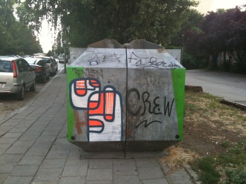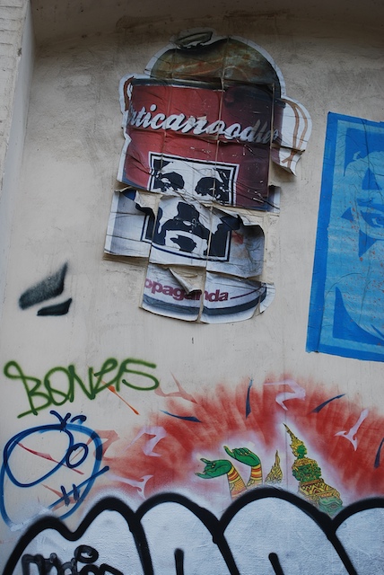 The area of Friedrichshain is also well known for its art on the streets, and the warren of bars, warehouses and skate park on Revaler Strasse contains hundreds of pieces, some commissioned, some added spontaneously. Amid a riot of tags, stencil, paste-ups and pieces near the Cassiopeia skate park I found a piece by Orticanoodles, with – once again – a tag by Bones accompanying it: