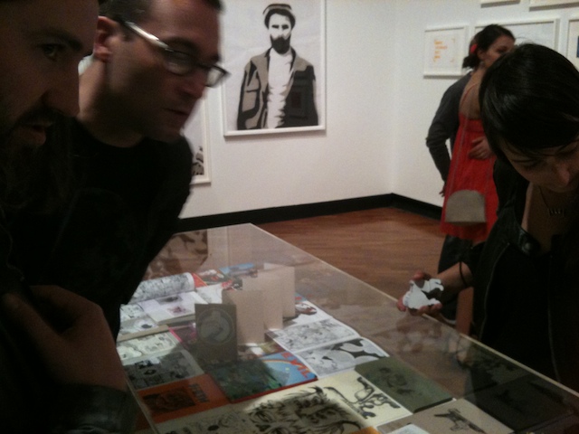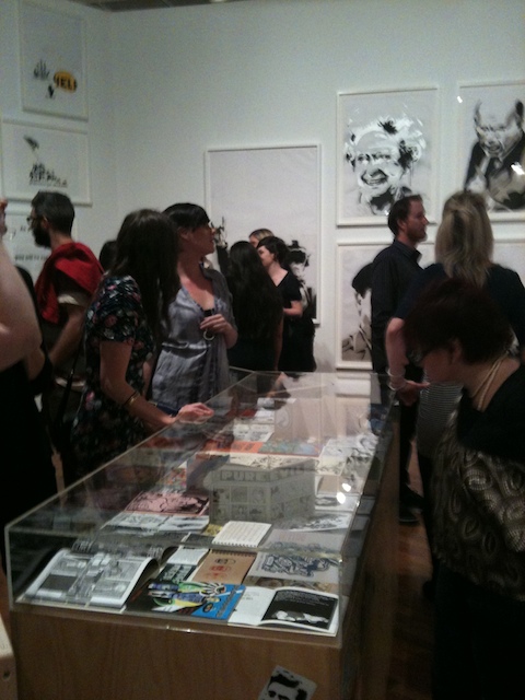 Meanwhile, upstairs in the Project Gallery, was the exhibition: a number of rooms containing a selection of the National Gallery of Australia’s large collection of street art (it has purchased over 350 works). The works are displayed with imagination and intelligence, organised according to themes such as ‘Neo-Pop’, ‘Connecting Crews’, ‘Politics and the Press’ and ‘The Return of the Hand’. There’s a display of zines (some of which you are able to read, as well as examine others in glass cases), and surfaces for stickering, with many of the visiting artists taking the opportunity to add their stickers to the display.