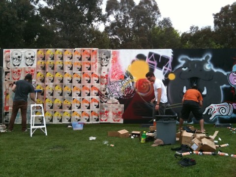 Outside, in the museum forecourt, Everfresh spent the day painting a wall, while a happy crowd of friends, fellow artists and interested visitors sat around on the museum grass and watched: