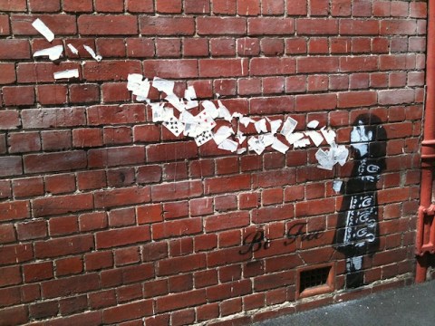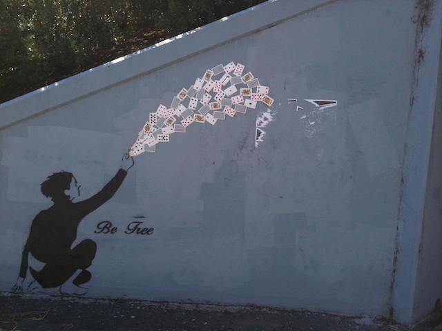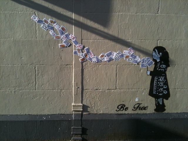 It’s a nicey composed work, a combination of stencil work for the figure and the text (which reads ‘Be Free’), with playing cards glued to the wall as though the little girl is scattering them to the winds.