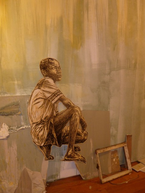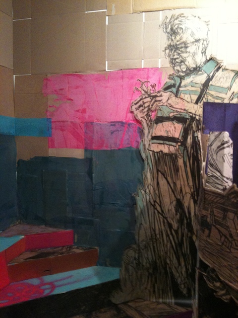 The show uses every inch of the gallery’s available floor space, and in addition re-shapes the gallery rooms (by adding painted and graffiti-ed steps here and there) and transforms its textures, by cladding its white walls with paper and cardboard. The artworks are sometimes affixed to these transformed walls; at other times they stand upright on the floor, angling out from the walls so that the exhibition has a pleasingly multi-dimensional feel. Apparently it took the best part of two weeks to install this show, and the efforts were well worth it – the space looks incredible.