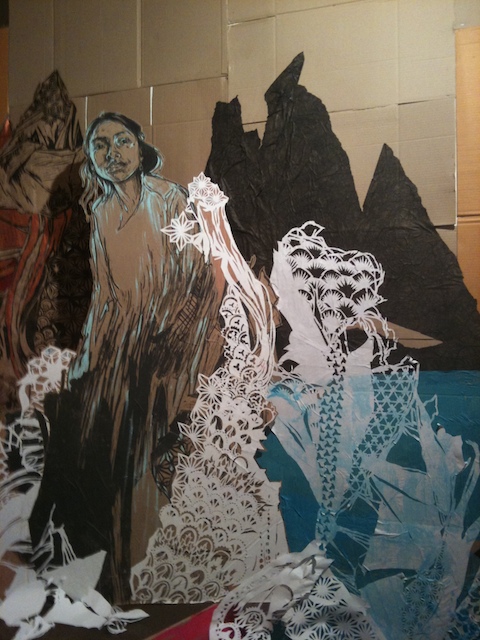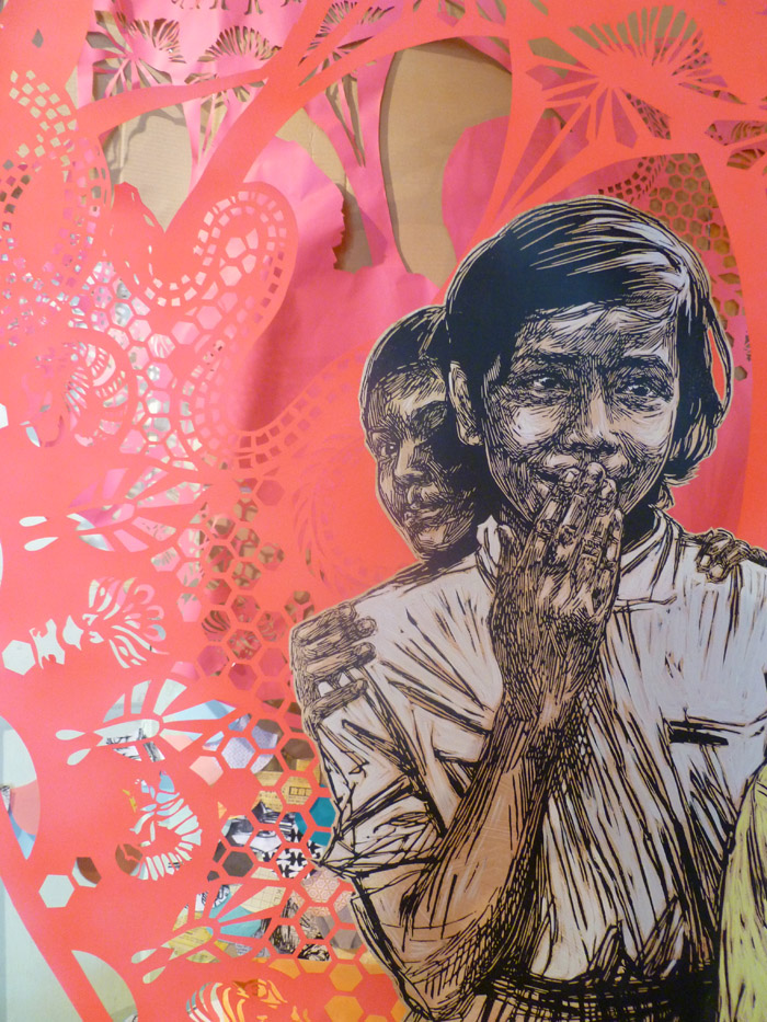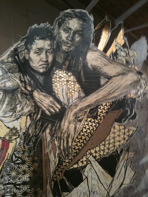 Some of the works I had seen before, on the streets or in other galleries. Even so, they are given a freshness by virtue of their inclusion here in a coherent large-scale show, which allows all of Swoon’s great strengths as an artist to be displayed: the sense of storytelling, the vividness of the characterisation of her subjects, the many different skills used in making the artworks, and the way that a gallery space is taken over by the artworks and converted, temporarily, into something else – some other space.