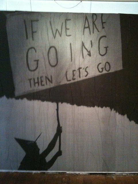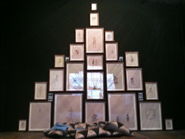 They could be viewed at a distance, or from up close, but to approach them, the spectator had to crouch and walk through a fragile tunnel created from black filaments extending, web-like, from the walls and the ceiling to the floor, at times only semi-visible against the black-painted gallery walls. The effect was a concentration of the gaze upon the artworks and a heightening of the sense for the spectator that in viewing these artworks one passes from the world of the everyday into another space and time. You can see shots from the opening night, along with some images of individual works, here.