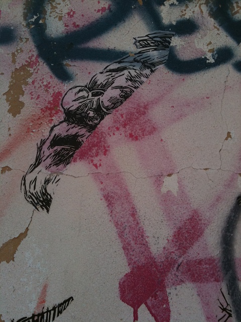 They also made me think of how sometimes street artworks are torn by cleaning crews, or by acquisitive fans, trying to take a work from public space for themselves. Like this remnant of a Swoon paste-up, forlornly clinging to a wall, the main body of the artwork torn down: