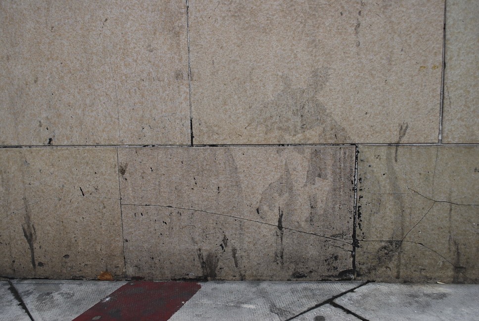 It looks like a red smudge on the pavement, but it’s the remains of another Banksy. If you look more closely at the wall next to the smudge, you can see the traces of the two rats stencilled on the walls: